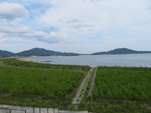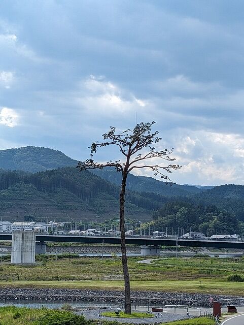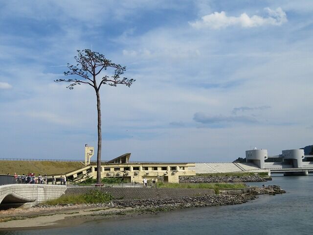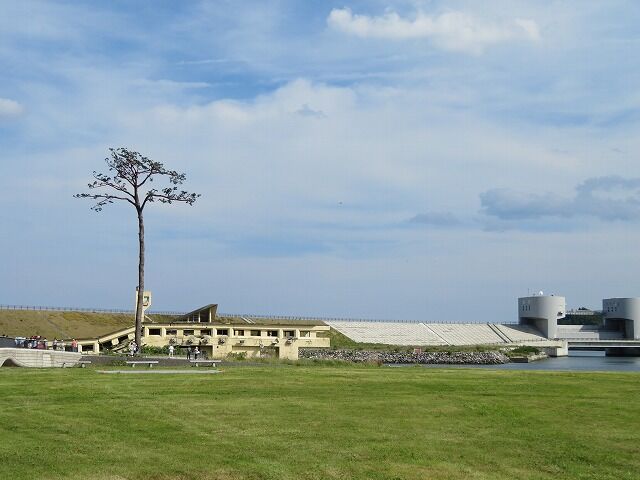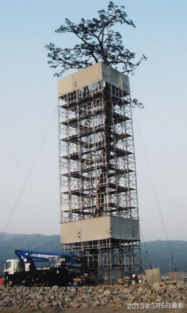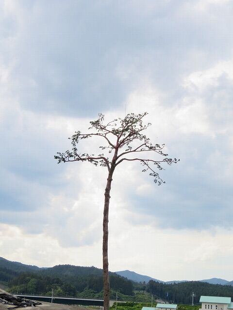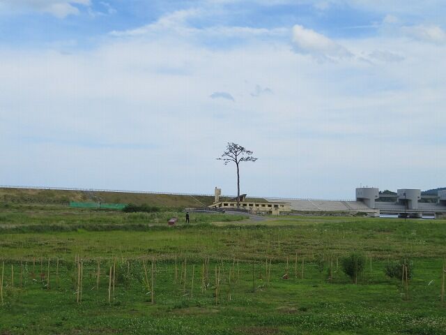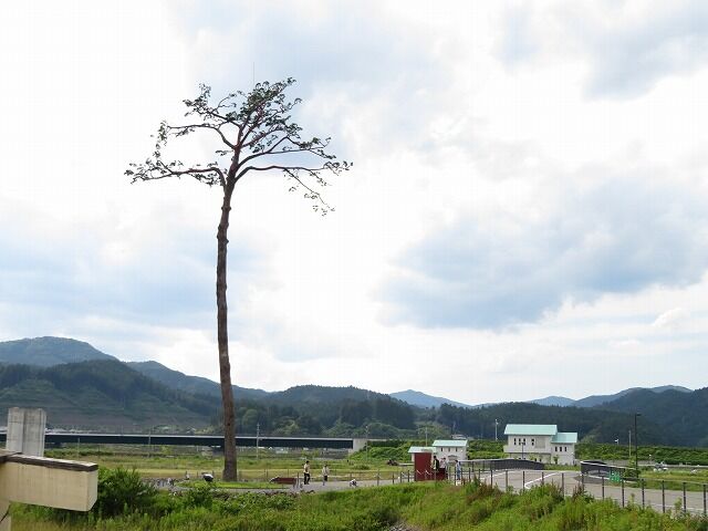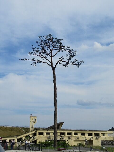 案内板「奇跡の一本松」より…『平成23年3月11日に発生した東日本大震災津波は、東日本各地に未曾有の被害をもたらしました。陸前高田市においても多くの方が犠牲となり、市街地は壊滅し、市の象徴であった高田松原も失ってしまいました。そんな中、唯一耐え残ったのが「奇跡の一本松」でした。震災直後から、陸前高田市民だけでなく全世界の人々に親しまれてきた「奇跡の一本松」、その後、海水による傷みによって枯死してしまいましたが、陸前高田市では、この一本松を鎮魂・希望・復興の象徴として保存することといたしました。この保存事業は、日本全国、そして世界からの数多くのご支援によって実現したものです。みなさんの想いがこめられた「奇跡の一本松」は、これからもずっと、わたしたちを見守りつづけます。平成25年3月陸前高田市』・『The tsunami from the Great East Japan Earthquake that struck eastern Japan on March 11th,2011 left extensive damage in its wake.Many in Rikuzentakata lost their lives,and our city was left in ruins.We also lost the symbol of our town,the 70,000 pine trees in Takata Matsubara.What remained in all this destruction was the tree of hope,the"Miracle Pine". The "Miracle Pine" was loved by those left behind in Rikuzentakata as well as many from around the world.Damaged by seawater,unfortunately it died.The City of Rikuzentakata decided to preserve this lone pine tree as a symbol to honor the souls of the deceased,and of hope and recovery.The preservation of this tree has been made possible by support from many throughout Japan and around the world.This"Miracle Pine"which captured the hearts of so many will continue to watch over us. City of Rikuzentakata,March 2013』