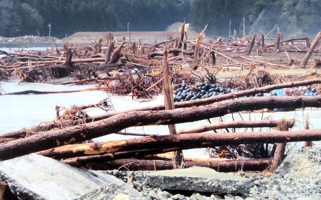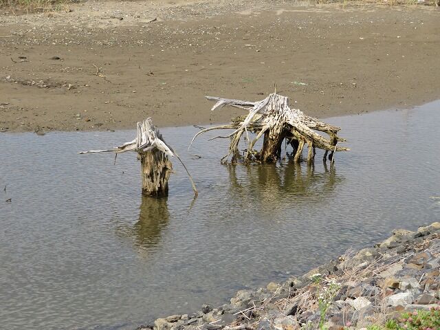 被災したマツの根株…『巨大津波に襲われた名勝高田松原。江戸時代から植林を重ね、地域の人々に親しまれてきた約7万本の松林は、津波に飲み込まれ、そのほとんどが流失しました。津波の去った後には、地面の砂が洗われて浮き上がったたくさんのマツの根株が残されていました。朽ちてはいますが、目の前のものがその一部です。被災3年目の2014年(平成26年)からは、防潮堤の海側、全長約2km、8haの敷地に、マツの植生基盤となるよう平均約4mの盛土が行われ、約4万本のマツを植林して新たな高田松原を再生する取り組みが行われています。また、防潮堤の陸側へのマツの植林計画も進んでいます。』