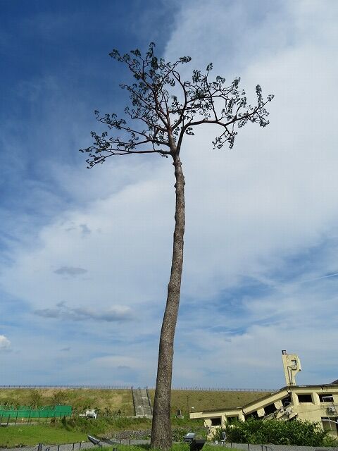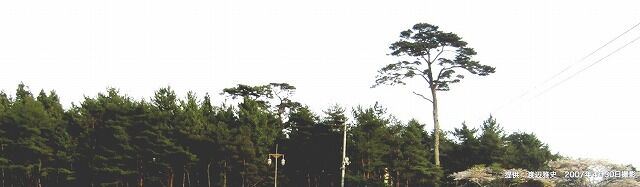被災前の「奇跡の一本松」。「陸前高田ユースホステル」近くに立ち、高田松原を形成する他のマツよりも一段と大ぶりな樹体だったことがわかります。