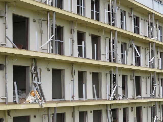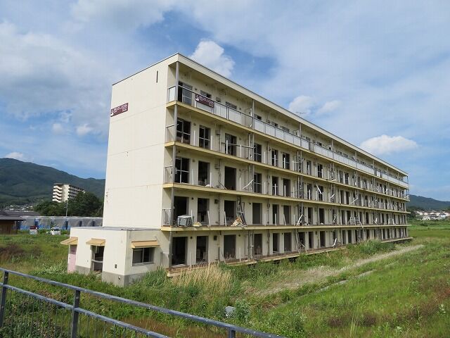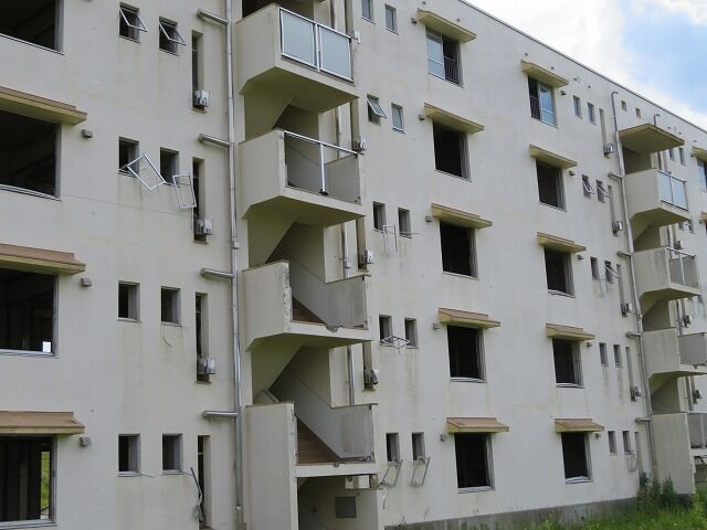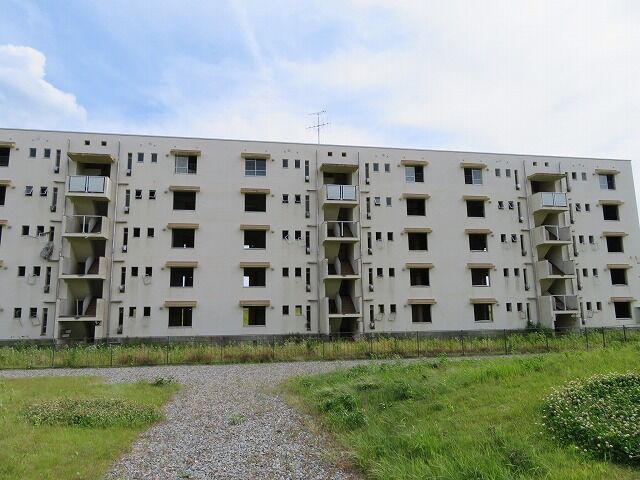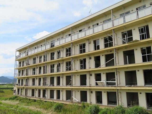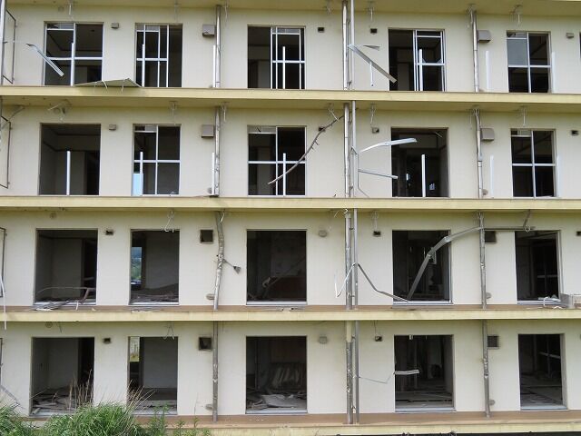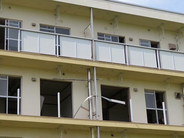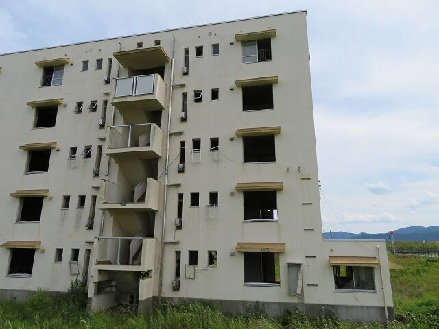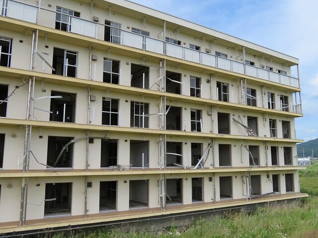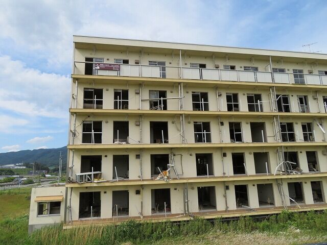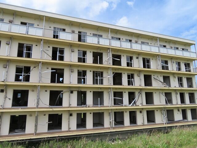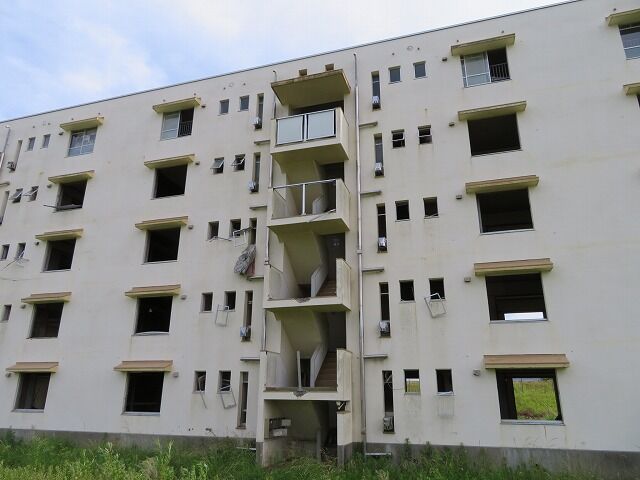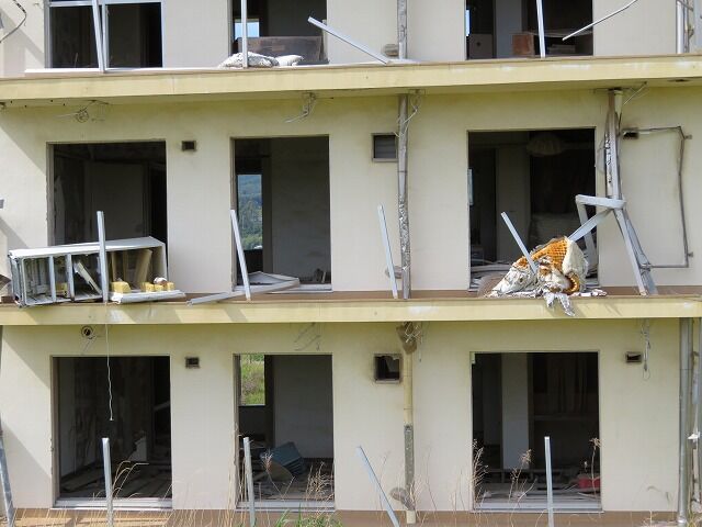 案内板「震災遺構下宿定住促進住宅」より…『【震災前の下宿定住促進住宅】下宿定住促進住宅は、1981年(昭和56年)に完成した鉄筋コンクリート5階建て、高さ約14.8mの建物です。財団法人雇用促進事業団の管理だった雇用促進住宅を、2009年(平成21年)に陸前高田市へと移管した集合住宅でした。国道45号沿いに位置し、名勝高田松原や古川沼などにも近く、商業施設にも近接した環境でした。東日本大震災津波発災時には2棟が建っており、1棟あたりに3DKの住宅が40戸、両棟合わせて80戸のうち45戸が利用されていました。そこでは、発災直前まで、人々がいつもの暮らしを営んでいました。現在は、海側にあった1棟だけが震災遺構として保存されています。【被災状況】2011年(平成23年)3月11日、大地震に続いて発生した津波は、最上階・5階の床上まで達しました。残された建物は、海側のベランダや窓が4階まですべて波によって破壊され、5階のベランダにだけ、かろうじて化粧パネルが残っています。一目見ただけで、津波による浸水の高さがわかるこの建物は、東日本大震災津波の想像を絶する脅威を物語る震災遺構として、当時の姿のまま保存されています。東日本大震災津波発災当時、下宿定住促進住宅は海側と山側の2棟ありました。被災後の姿を見ると、ベランダの損壊の様子から、震災遺構として保存されている海側の建物(1号棟)が、山側の建物(2号棟)に比べて圧倒的に被害が大きかったことがわかります。』