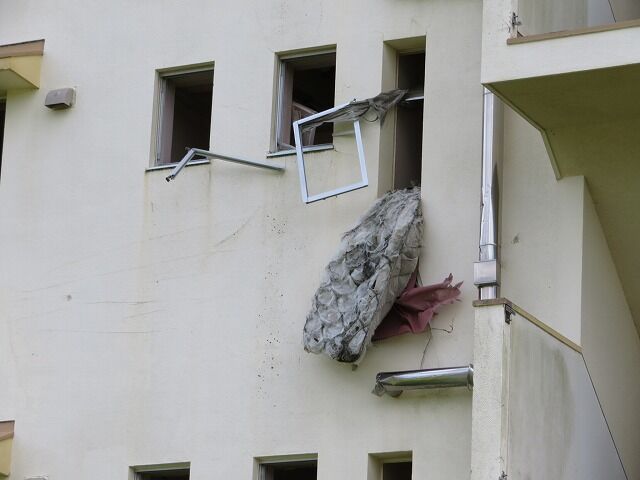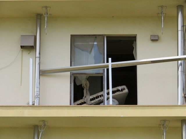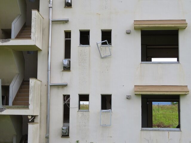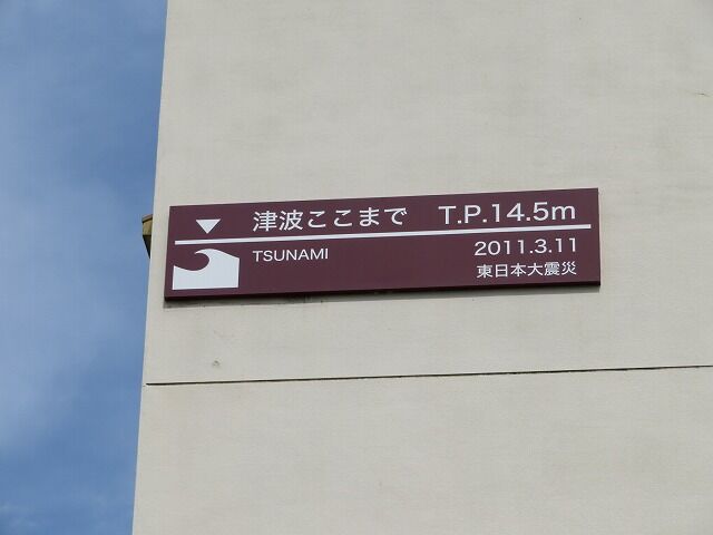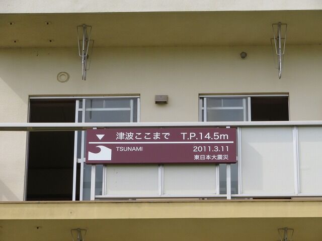 案内板「下宿定住促進住宅」より…『国道45号の海沿いに建つ下宿定住促進住宅は鉄筋コンクリート5階建ての市営住宅でした。東日本大震災津波で完全に水没した4階までのベランダや窓はすべて波に打ち抜かれ、床上まで浸水した5階はベランダの化粧パネルが辛うじて残っています。一見してどこまで津波が到達したのかがわかるこの建物は、想定をはるかに上回る津波の破壊力を如実に物語る震災遺構として、当時の姿のまま保存されています。』