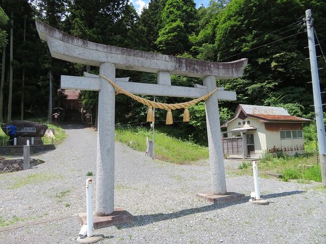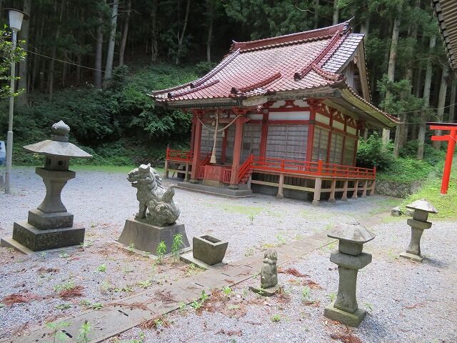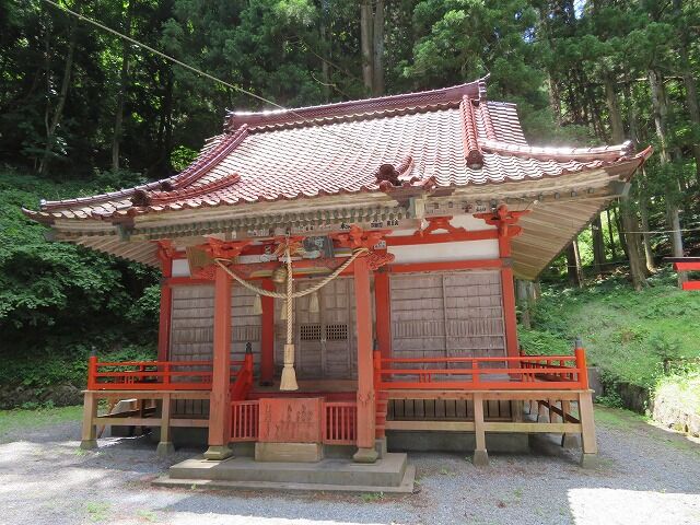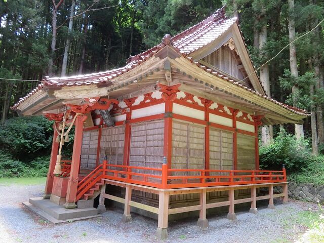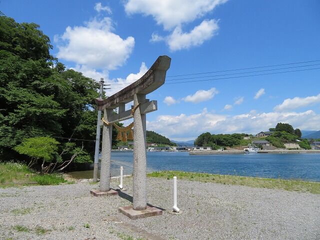 本殿は後方の山の上に鎮座。一般的な地図にも尾崎岬に「尾崎神社」が2社別々に記されており、海沿いの社が遥拝殿で山側の社が本殿です。