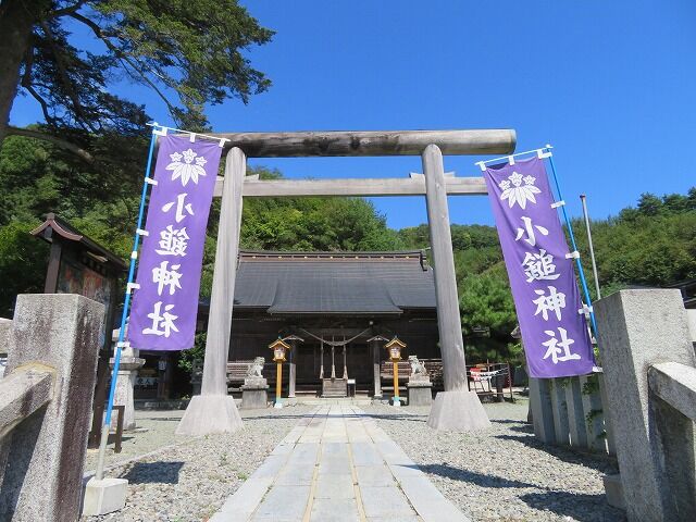 小鎚神社略記…『【一、御祭神】日本武尊【一、例祭日】9月23日【一、由緒】当神社は、大同の頃、新山牧場の入口、明神平に土地の開拓者芳形氏を祀ったのがその起源とされている。第一次に一の渡、第二次に古明神に移り、更に寛永6年(1629)9月現在地に遷座された。往古より地方開拓の産業神及び武の神として普く崇敬される。例祭には必ず代官の奉幣参拝があった。明治5年(1872)に村社に列格、同41年(1908)3月、神饌幣帛料供進神社に指定。昭和21年(1946)郷社昇格、内規上は郷社に該当すると認められしも社格制撤廃のため今日に及ぶ。【一、東日本大震災】平成23年3月11日、境内駐車場(約2メートルまで浸水)まで大津波が押し寄せ瓦礫で埋め尽くされる。その後、山林火災で本殿裏まで火の手が追ったが氏子の懸命な消火活動により奇跡的に被災を逃れる。』