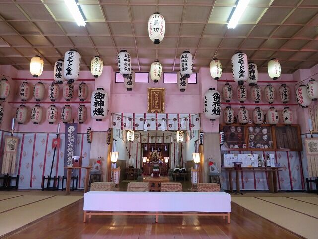 拝殿内。拝殿内神額(佐々木忠郎奉納)。