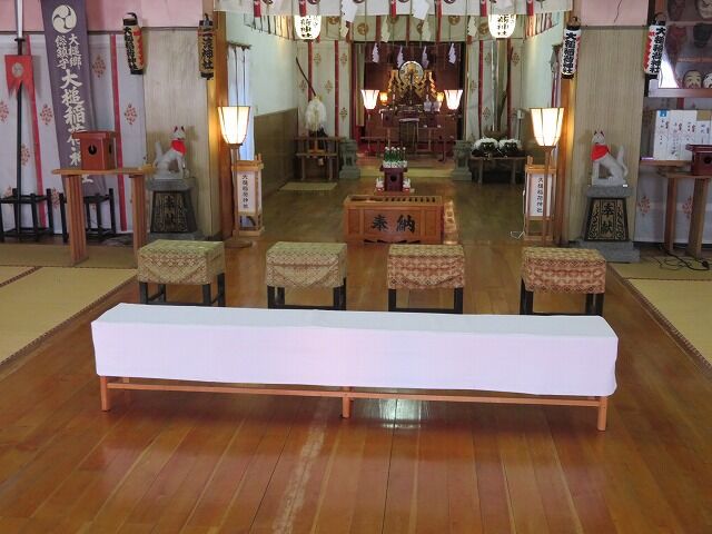 大槌城山虎舞HP「大槌稲荷神社(二渡神社)」より一部抜粋…『【祭神】稲倉魂命【合祀神】健御名方命【祭日】旧8月9日【由来】大槌稲荷神社は二渡神社とも呼ばれ、その由来は最初大屋(安渡小国家屋号)で奉祀した場所は安渡寺沢地内大槌稲荷神社の笹原という処(現安渡三丁目地内)であったが、安渡村民の願意も厚く正保2年(1645)に波辻崎(現安渡三丁目水門付近、水天宮)に移したという。笹原鎮座の時代は笹原稲荷と呼ばれ大屋の氏神的存在であったが、波辻崎に移って波辻崎稲荷と称された頃は既に漁村の鎮守に任じたものであった。その後、波辻崎は参詣に不便という理由から享保5年(1720)、前川氏・里館氏が発願者となり氏子が協力して現在地に移転することとなる。このおいなりさん2回の移転が二渡の神社名の根拠となる。稲荷神は本来穀物の神でありその神体尊像も稲を肩にになった老翁の姿であって、2月初午を祭日とすることが普遍的に行われてきた。狐はその神使であり、萬能に通ずるといわれた狐は村民に畏敬され、田の神の神使と思われこれを尊信する風が稲荷信仰に随伴したものと考えられている。稲倉魂命を本体とする稲荷信仰は江戸時代になると単に農耕神のみでなく、収穫つまり収入の神として商業神的性格も持つようになり、ひいては漁村や漁港で漁の神としても祀られるようになった。【まつりの歴史】元文年中(1736~)には二渡の神輿は四日町(現上町)、八日町(現本町)まで渡御していた。安永8年(1779)9月、二渡神社の祭礼はこの頃は29日に行われ、元文以来両町まで神輿渡御するも、短日で廻りかねるので安渡限りにしたいと願出てこれを許された。文化九年(1812)になると南部藩主が神道支持を打ちだし、従来は神道派(小槌神社)と修験道(二渡神社)が両立していたのに、翌文化10年(1813)からは神道派以外の各社は神輿渡りの祭事を差止められ、二渡神社や町方の観音の祭礼も禁止の憂目に逢った。また、これにまつわる話として先に述べた文化9年の藩令により、代官所を通じて二渡神社を当時の小槌明神別当に神社を掛持ちさせるとの通達があった。小槌明神別当は安渡の船頭達に二渡神社申受けの旨を伝えたところ神輿から戸障子の果てまで二渡の山から引き下げ、村中大騒ぎとなっている。文献によれば文政3年(1820)「差留中の神輿渡御の祭事を、願出れば許すの回状あり」とあるので、1813年~1820年までの7年間は二渡神社の祭礼は行われなかったことになる。-町立図書館蔵「大槌町史」より抜粋-【災害を越えて】平成23年3月11日の大震災 大津波の際には高台に鎮座していた為、難を逃れた。有史以来、何度となく津波の被害を受けてきた安渡地区を守護する神社として、高台建立は必然的だったと思われる。震災後約5ヶ月間、避難所として地域住民の臨時の生活拠点となる。』