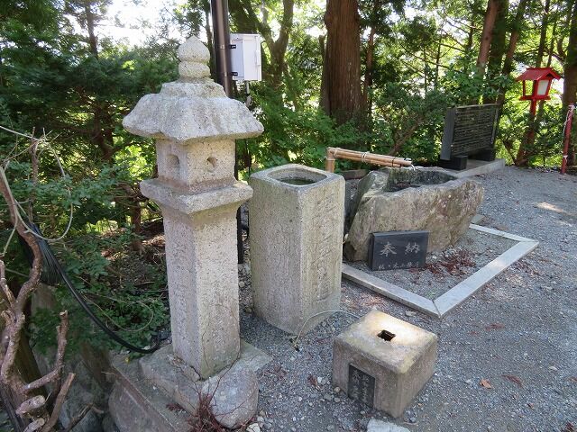 石灯籠一対と手水鉢(町指定有形文化財)。豪商前川善兵衛(4代目富昌)の寄進。