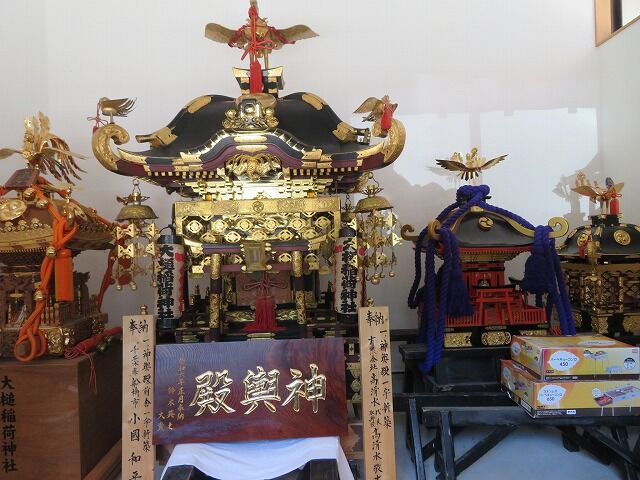 現在の神輿(左から2番目)は新調されたもので、両サイドの小さな神輿は、震災後に持ち手不足を危惧した支援者が少人数でも担げる神輿として、子供神輿と併せ寄贈したものです。