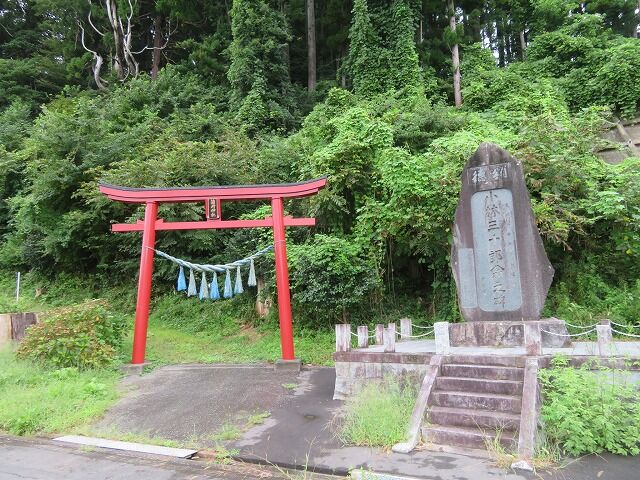 鳥居(奉納:箱﨑神社氏子、本体工事:佐々木鐵工佐々木洋一郎、施工基礎工事:有限会社荒屋組代表取締役荒屋齊。平成7年3月吉日)