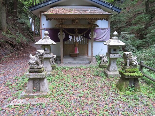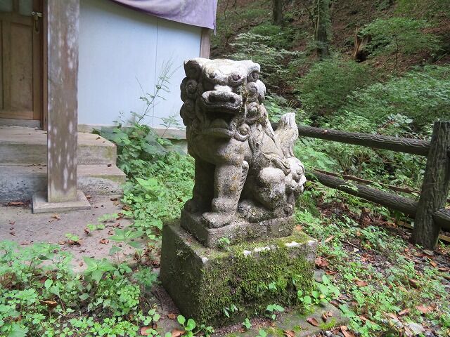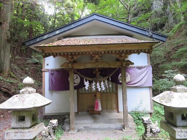 由緒…『奥の宮は海岸に屹立する海抜610メートルの山頂にあり、本社は鯨山の南麓の不動滝の下に鎮座す。山頂にある石の万年堂に、寛延4年(1751)8月建立とあれば、創立はこの頃と考えられる。鯨山は上閉伊・下閉伊郡に跨り太平洋を眼下にでき、眺望絶景、神験顕著なるを以て登山参拝する者も多い。平成19年には老朽化した社殿を改築した。不動滝は15メートルの落差であるが、滝の岩肌と老大樹に囲まれ、幽玄的な神域を作っている。』