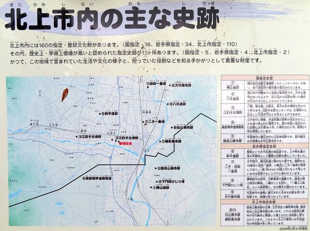 北上市内の主な史跡。内容は省略。紹介されているのは①樺山遺跡(国指定史跡)②八天遺跡(国指定史跡)③江釣子古墳群(国指定史跡)④南部領伊達領境塚(国指定史跡)⑤国見山廃寺跡(国指定史跡)⑥新平遺跡(岩手県指定史跡)⑦二子・成田一里塚(岩手県指定史跡)⑧下門岡ひじり塚(岩手県指定史跡)⑨大竹廃寺跡(岩手県指定史跡)⑩白山廃寺跡(北上市指定史跡)⑪横町廃寺跡(北上市指定史跡)