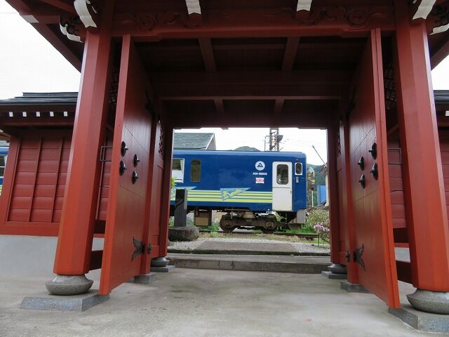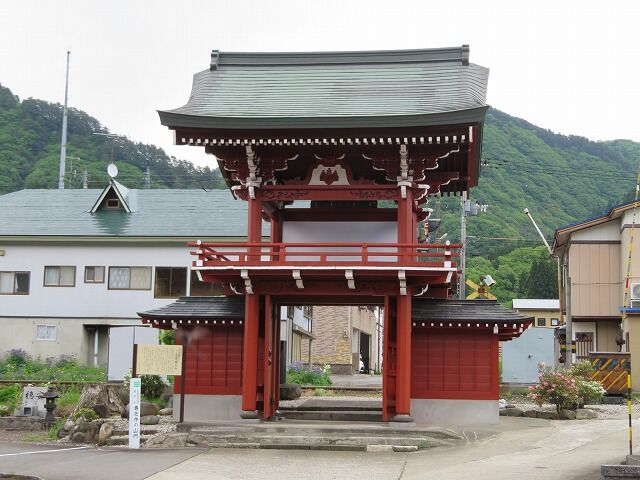 パンフレットより…『【専念寺】開山年不明。もとは真木沢鉱山お台所付近(ガソリンスタンドの奥)にありましたが、1616年に現在の場所に再興されました。浄土宗の寺院です。総本山は知恩院(京都府)。【山門】1693年に浄土宗総本山である京都の知恩院の三門(国宝、知恩院では山ではなく三を使います)の形をとって建立され、市指定文化財となっています。山門の前に踏切があるため、「山門とすれすれで通過する秋田内陸線」が撮れるということで、写真好きの人が訪れる撮影スポットにもなっています。山門にある家紋は秋田藩を統治していた佐竹家から拝領したもので、専念寺の裏~阿仁合駅の間で阿仁川に面した土地を佐竹家に上納したときのものです。※ただし、まったく同じ家紋(五本骨扇に月丸)にはできないので、丸が2つになっています。【大坂屋彦兵衛の墓石】有力な山師であった大坂屋彦兵衛の墓石で、北前船で大阪から運ばれた瀬戸内海原産の赤御影石が使われています。建立は1689年で、市指定文化財になっています。御影石は大阪へ金銀銅を運んだ船が日本海を北上して戻るとき、船を重たくしてバランスをとるために積んだものといわれており、財力がある者の墓によく使われました。【巨大龍天井絵】畳9畳分になる巨大な龍の絵です。第24代住職の珠井証志氏が平和への願いを込めて自ら描きました。【振り向き如来像】とても珍しい振向いたような姿の如来像で、左足を一歩前に出し顔は右を向けて極端に前傾しています。このように正面を向いていない仏様は全国でもとても少なく、その中でも有名なものとして永観堂(京都府)の「みかえり阿弥陀像(国重要文化財)」があります。永観堂の「みかえり阿弥陀像」は「左向き」「直立姿勢」です。専念寺の「振り向き如来像」は「右向き」「前傾姿勢」です。』