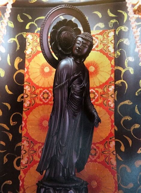 パンフレットより…『【振り向き如来像】■振り向き如来像について…専念寺の山門とともに、元禄6年(1693年)に左甚五郎(※江戸時代初期の大工・彫刻師。播磨の人。徳川家の造営大工の棟梁と伝える。日光東照宮の眠り猫、上野東照宮の竜などを彫ったとされるが、伝説的人物と考えられ、その実態は不明。)によって彫られた作と言われている。左足を一歩前に出し、顔は右を向き、極端に前傾したその姿は、全国にも類を見ない。まるで振り向いているようなその姿から、専念寺ではこの如来像を「振り向き如来」と呼んでいる。■当時の時代背景について…振り向き如来像が造られた頃の日本は、江戸幕府による鉱山開発の盛んな時代であった。江戸幕府の設立当初、徳川家康は金銀の採掘量を増加させるため、慶長16年(1611年)に「山例五十三箇条」を制定し、坑夫たちが全国各地で自由に仕事が出来るよう配慮した(※山例五十三箇条が制定されたのは1573年、1588年、1611年の諸説あるが、1611年に正式に制定されたという説が有力となっている)。その結果、全国的に見ても採掘量が多い阿仁鉱山には全国各地から多数の「渡り坑夫」が訪れるようになった。■振り向き如来像に込められた想い…渡り坑夫の中には過去に過ちを犯した者や隠れキリシタンなど、何かしらの理由で故郷にいられなくなった者が数多く存在していたが、阿仁鉱山も例外ではなかった。「振り向き如来像」は極端に前傾姿勢を取っているが、実のところこれは「如来がつまづいた姿」を描写したものではないかと伝えられており、ご檀家さんの間では親しみを込めて「ズッコケ如来」とも言われている。「佛様でもつまづくことがあるのだから、一度や二度の失敗で深く心を病ませることはない。」左甚五郎20代前半の血気盛んな頃の作品と思われるゆえに、あえて佛をつまづかせる事ができたのであろう。彫師である左甚五郎の如来像に込めた想いは、300年という時間を越え、未だなお私たちに語りかけている。』
