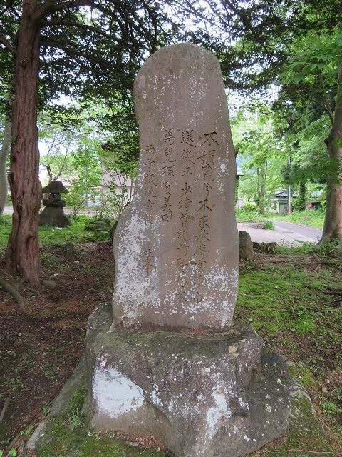 庄司喜孝翁追思碑…『庄司喜孝翁追思碑 正三位勲一等尾崎行雄題額 翁姓庄司氏諱喜孝通稱友五郎別號誠義父諱喜賢稱彦左衛門翁其次子以天保十一年九月生於羽後水無村其族諱喜昌稱宰吉無子養翁為嗣翁為人温厚摯實有長者風常以身任公事専心竭力莫不至為衆倚信之推舉村總代後為郵便局長兼戸長收入役町會議員學務委員其於町政通信事務所貢獻甚多官録功績敘正八位勲八等捐貲助公事廔賜褒賞阿仁川奮以渡舟通住來衆苦不便及翁為戸長刻苦經營架橋曰喜鵲橋里人徳之明治四十二年二月三日病歿享壽七十佛諡曰最勝院釋良知禪士塟於金山善勝寺塋域配北村氏生四男五女長龜治承家次乙吉別成家居大阪餘蚤折女出適人翁胒事公務殆四十年恪勤勵精未曽以繁劇言勞暇則作俳句嘯風吟月以為樂郷黨僉慕其徳及歿識與不識莫不悼惜頃者里中親故相謀立碑以追思遺徳並使後人有所觀感銘曰為公志身或有其人世慕遺徳君子所難豈可無傳勒銘貞珉 昭和四年歳在己巳十月立 香川 長尾甲撰并書 能代三輪嘉尚彫』※かなり自信なし