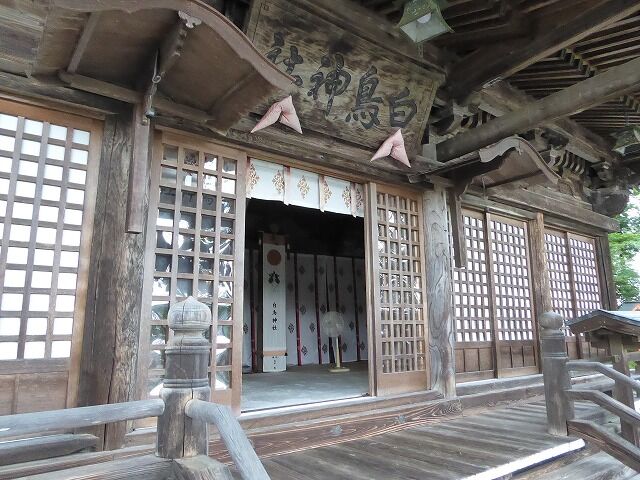 『白鳥神社は第50代桓武天皇の延暦20年(801)に坂上田村麻呂蝦夷平定に際し、日本武尊を鎮祭せる由緒深き神社であります。旧社殿は嘉暦2年火災に罹りその後仮宮のままであったが、光格天皇の享保元年1000年祭を執行するにあたり、現在の社殿造営に着手し3ヶ年の歳月をかけ享保3年(1803)に完成した。安永6年書上げの白鳥村風土記に「往古東夷御誅伐之伝勅詔坂上田村麻呂将軍御下向之時伊澤郡鎮守ニワ伊澤八幡村江岩清水八幡宮を奉安置 当村江ハ日本武尊ノ大鳥之神社白鳥大明神ト奉崇敬依而村名白鳥村ト改メ白鳥射討事堅相禁申候」と記されて白鳥を射ることを固く禁じたと伝えられている。大正2年白山姫命を鎮祭せる白山神社(白鳥合の沢鎮座)を合祀している。』