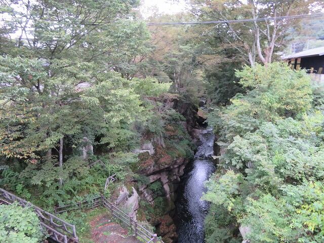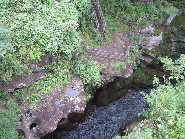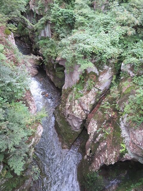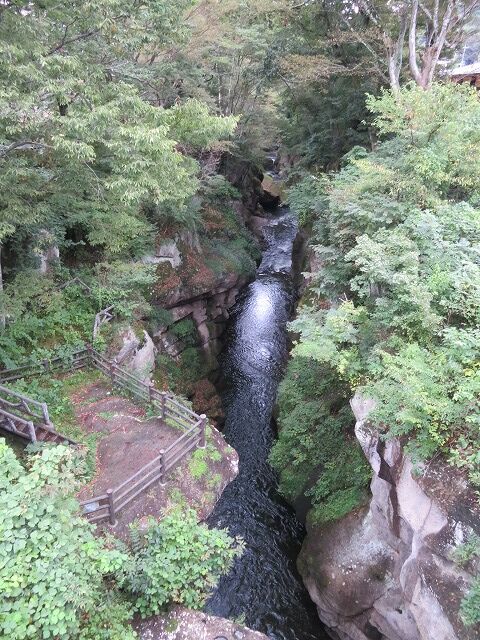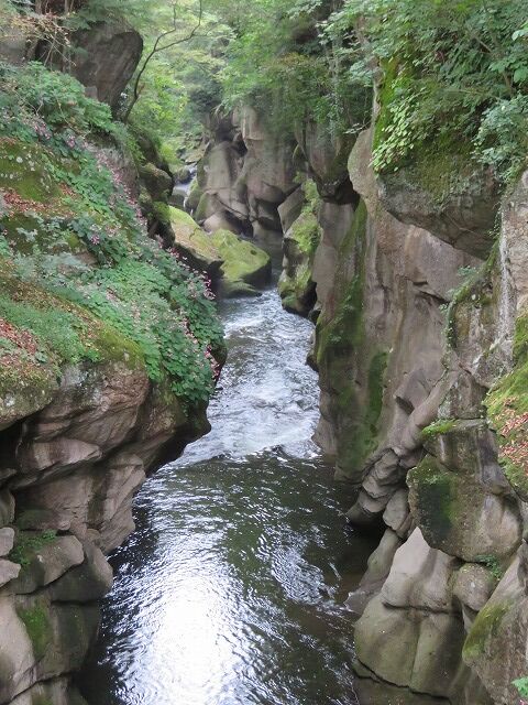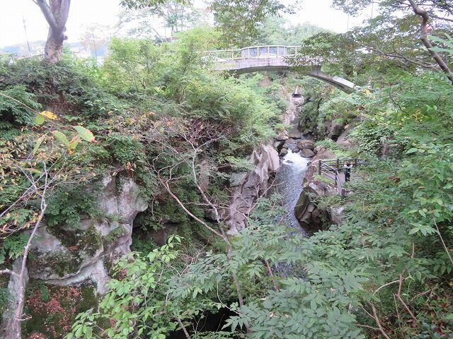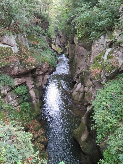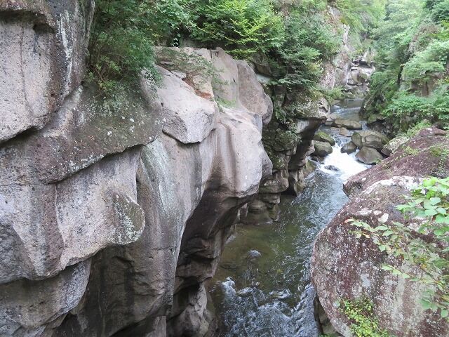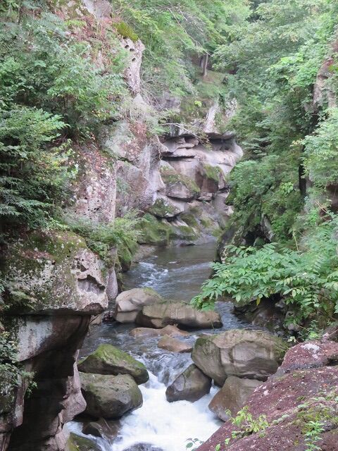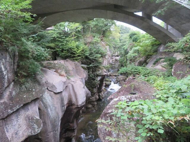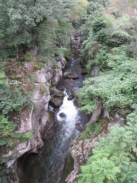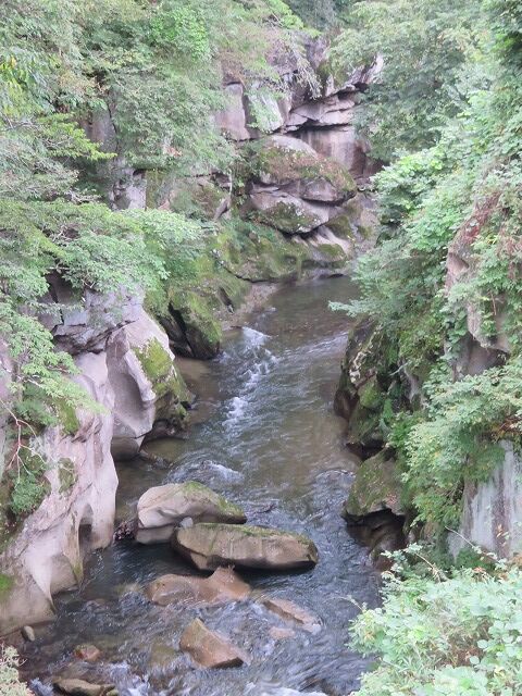 磊々峡(Wikipediaより一部抜粋)…『磊々峡(らいらいきょう)は、宮城県仙台市太白区を流れる名取川が秋保石の大地を侵食して作った奇岩が並ぶ峡谷のこと。秋保温泉地区にある。両岸の秋保石を浸食しながら流れる水が、急流となったり深い淵となったり、変化に富んだ峡谷の風景を楽しめる。磊々峡の名は、1931年(昭和6年)夏目漱石の門人でドイツ文学者の小宮豊隆が名付けた。覗橋の上下約1km。秋保温泉入り口の交差点(覗橋)から下流に650mの散歩道が整備されている。散歩道を歩くと奇面巌(きめんいわ)、八間巌(はちけんいわ)、時雨滝(しぐれたき)、天斧岩(てんおのいわ)など、見れば思わず納得してしまう名前が付けられた岩場や滝があり、それらを探して歩くのも楽しみの一つ。散歩道の中ほどにはベンチや東屋もある。雨上がりなどには足元が滑りやすくなり危険ではあるが、水量が増して流れが激しい、雄々しい磊々峡を楽しむこともできる。遊歩道に入るには、秋保・里センターに車をとめ、川沿いの散歩道から秋保温泉入り口の交差点にかかる「のぞき橋」脇から入るのが便利。』