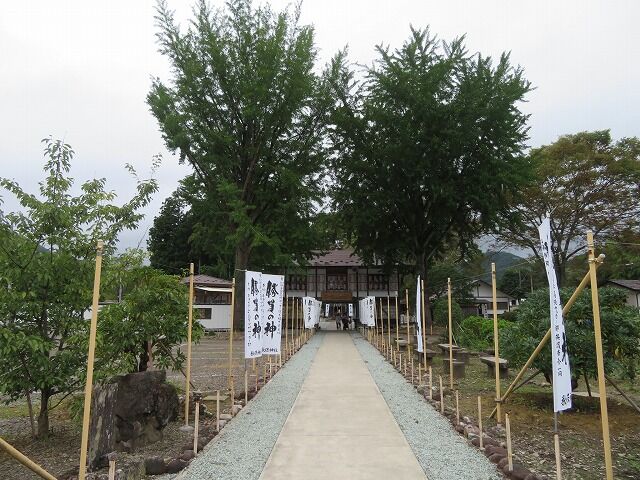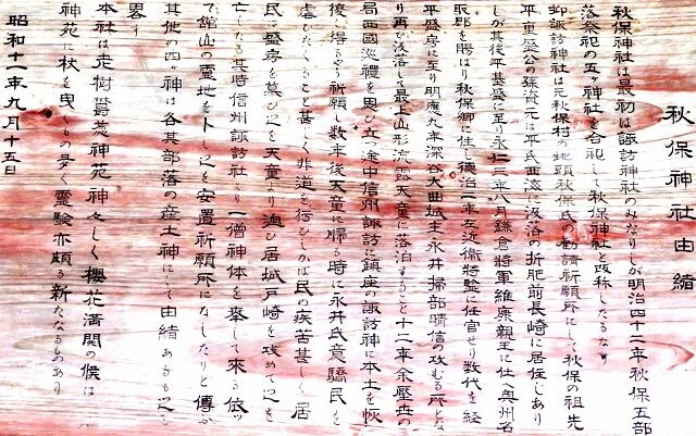 wikipedia「秋保神社」より一部抜粋…『【主祭神】健御名方命、天照皇大神、豊受皇大神、日本武尊、應神天皇、月読命、大巳貴命、少彦名命、軻遇突智命【社格等】旧村社【創建】大同3年(808年)【本殿の様式】権現造【例祭】9月15日【由緒】社伝によれば、秋保神社の創建は平安時代初期の大同3年(808年)、坂上田村麻呂がこの地に熊野神社を祀ったのが初めと伝わる。室町時代には、秋保村領主の先祖であり最上に流浪していた平盛房が、信州の諏訪大社に本土恢復と居城奪回を祈願し叶えられたことにより、諏訪大神の御神霊を勧請して諏訪神社として祀って以来、「戦の神」として崇敬されるようになった。慶長5年(1601年)には仙台藩の尊崇も寄せられるようになり、伊達家に庇護されて大社が建立される。正保3年(1646年)、第2代仙台藩主伊達忠宗の参詣があり、伊達家の永久祈祷が仰せ付けられた。明治42年(1909年)、明治天皇の勅命により秋保5ヶ村より馬場の愛宕神社、長袋の神明社、新川の新川神社と白山神社、湯元の湯神社、境野の八幡神社と羽山神社の各神社を合祀したことにより、秋保総社として社号を諏訪神社から秋保神社に改めた。』