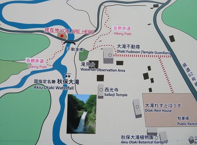 日本の滝百選秋保大滝…『森と水と山の里、日本には、いたるところに名瀑があります。深緑の断崖から落下する純白の滝を先人たちは「神」とあがめかけがえのない遺産として残してくれました。この秋保大滝が全国に約2500ヵ所もある滝の中から自然景観に最も優れた美しい滝として「日本の滝百選」の一つに選ばれました。この滝は幅6.0メートル高さ55メートルで昭和17年に国の名勝指定を受けている滝です。宮城県観光課』