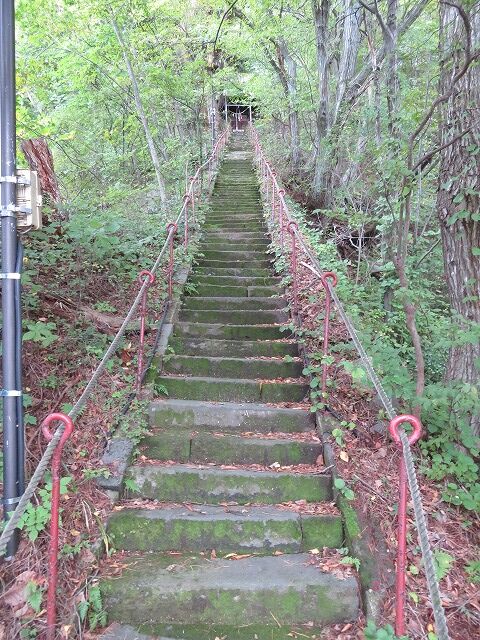 八幡坂。鳴子温泉2025カラコロまっぷというパンフレットによりますと急な階段は冬季通行止め。